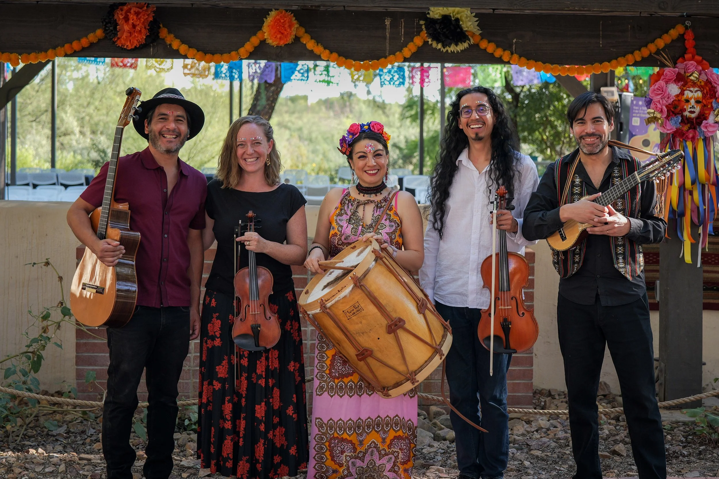 El SurCo is a musical collective that blends guitars, violin, charango, bombo, and vocal harmonies to bring to life chacareras, cuecas, chamamés, gatos, and other popular and folk stringed music traditions from Argentina, Chile, and surrounding regions. The word surco means groove in Spanish, and references the furrows where seeds are planted in agricultural fields. A musical term with a rural subtext that speaks to the landscape where many of these styles emerged and continue to thrive, El SurCo (or The Southern Collective) transport their listeners into the diverse and vibrant musical ecosystems of the Southern tip of the Americas. El SurCo is composed of Maxi Larrea (guitar, vocals, bombo), Jennie Gubner (violin, vocals, bombo), Andres Pantoja (guitar, charango, bombo, vocals), Diana Peralta (vocals, bombo), and Esteban Hernandez Parra (viola, bombo, vocals).